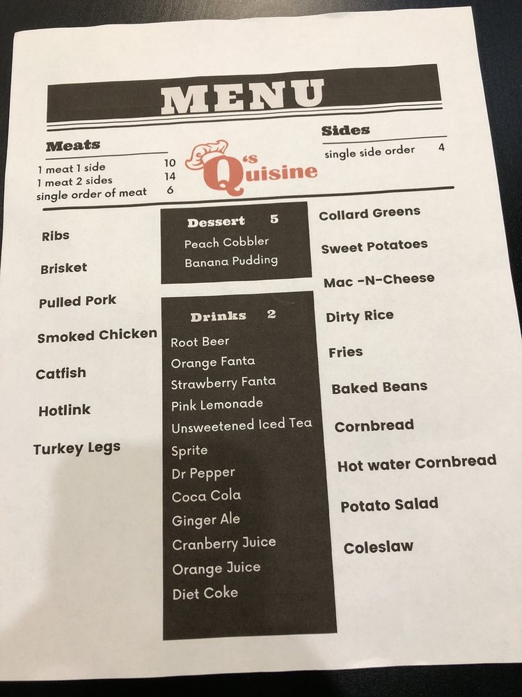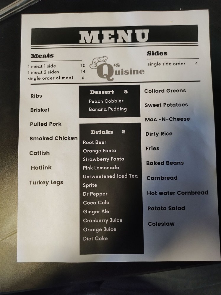 Q’s Quisine, a barbeque joint located in Aurora, CO, offers a range of delicious lunch meats like brisket, pulled pork, ribs, and smoked chicken. Their a la carte menu includes items like bacon, brisket, catfish, and more. For breakfast, patrons can enjoy options such as breakfast burritos, sandwiches, French toast, and grits bowls. The restaurant provides a welcoming atmosphere with excellent customer service, as noted by reviews praising the friendly staff and amazing food. Customers recommend Q’s Quisine for gatherings and casual dining experiences. The diverse menu offerings combined with the outstanding service and ambiance make Q’s Quisine a must-visit for barbecue enthusiasts.